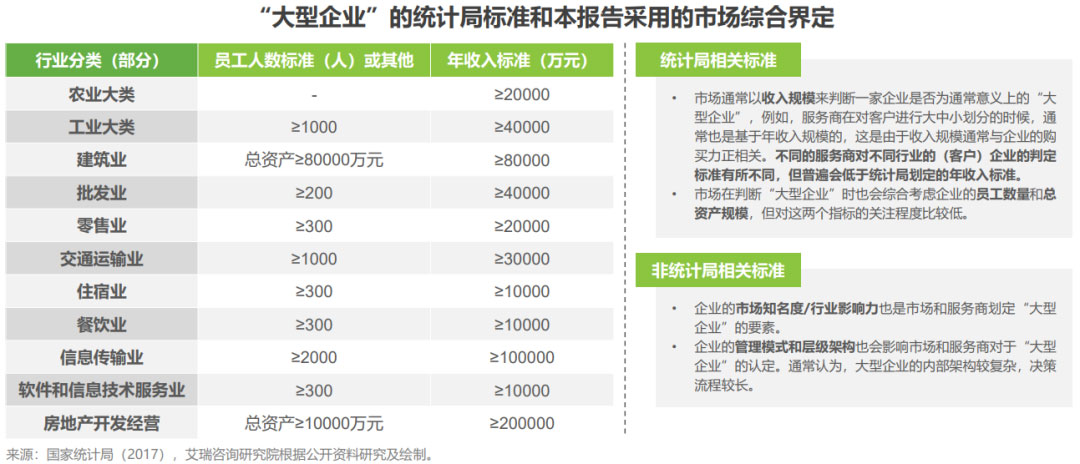 從市場(chǎng)和商務(wù)視角上看,報(bào)告所指的“大型企業(yè)”還包括上述指標(biāo)不顯著低于統(tǒng)計(jì)局標(biāo)準(zhǔn),且在管理模式、數(shù)字化需求、采購流程等方面具備下圖及報(bào)告第三章所示特征的企業(yè)。