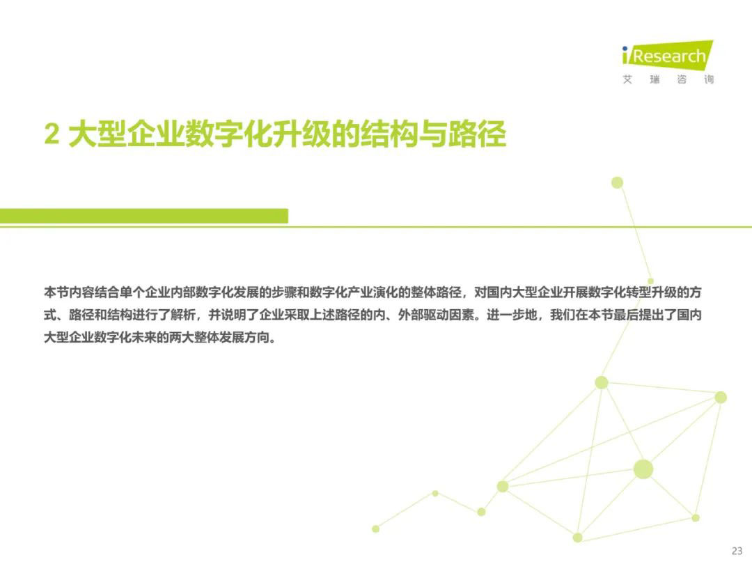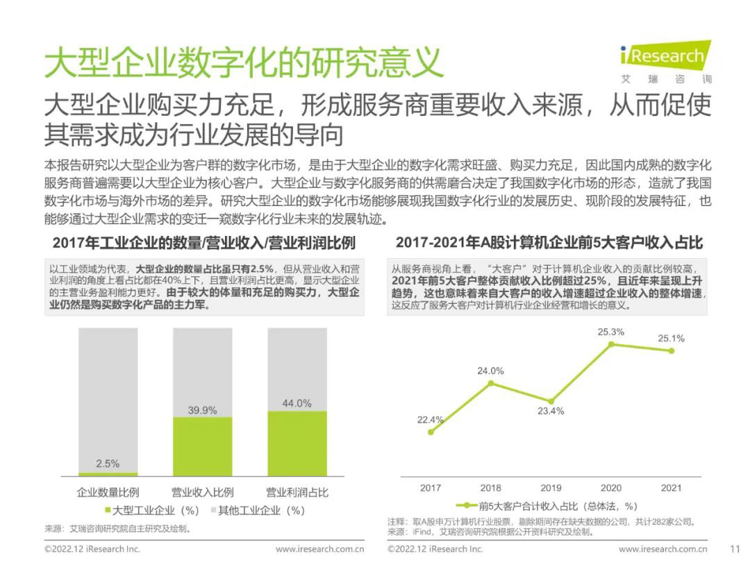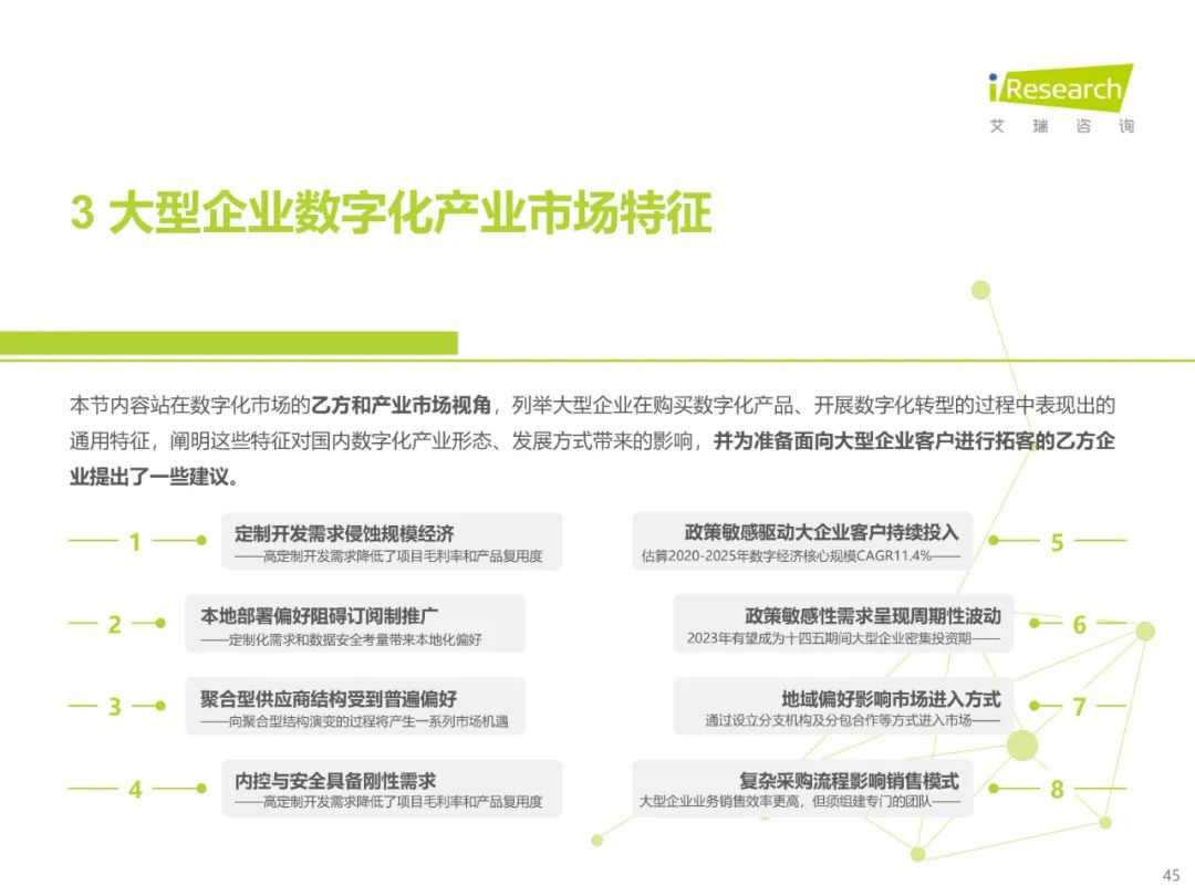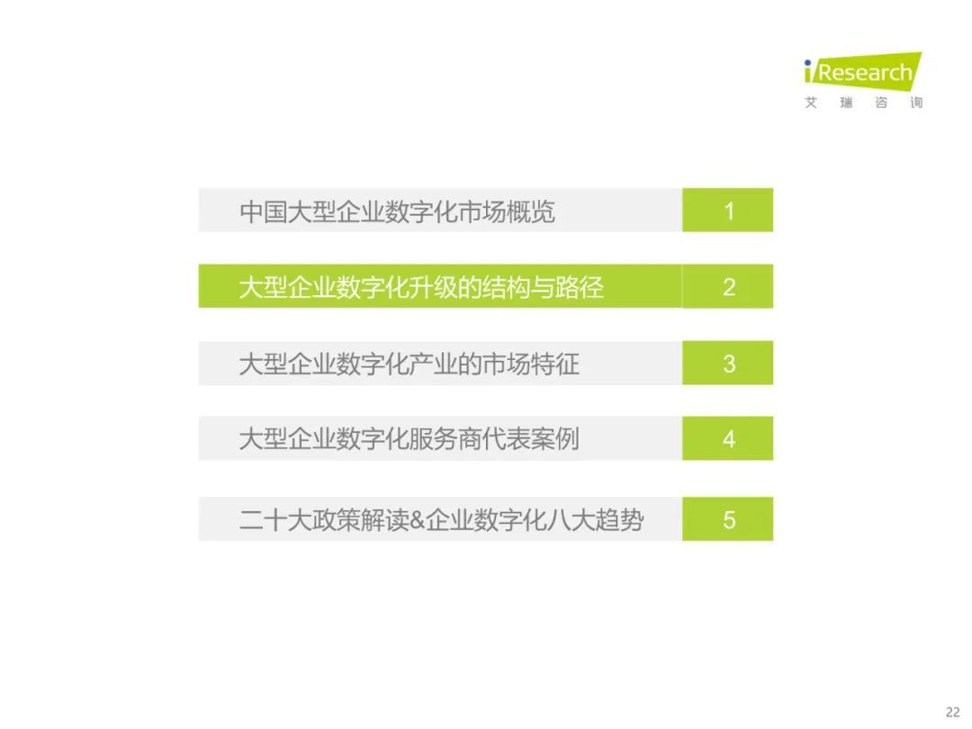 本報(bào)告研究以大型企業(yè)為客戶群的數(shù)字化市場(chǎng),是由于大型企業(yè)的數(shù)字化需求旺盛、購買力充足,因此國(guó)內(nèi)成熟的數(shù)字化服務(wù)商普遍需要以大型企業(yè)為核心客戶。大型企業(yè)與數(shù)字化服務(wù)商的供需磨合決定了我國(guó)數(shù)字化市場(chǎng)的形態(tài),造就了我國(guó)數(shù)字化市場(chǎng)與海外市場(chǎng)的差異。研究大型企業(yè)的數(shù)字化市場(chǎng)能夠展現(xiàn)我國(guó)數(shù)字化行業(yè)的發(fā)展歷史、現(xiàn)階段的發(fā)展特征,也能夠通過大型企業(yè)需求的變遷一窺數(shù)字化行業(yè)未來的發(fā)展軌跡。