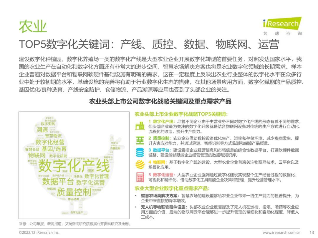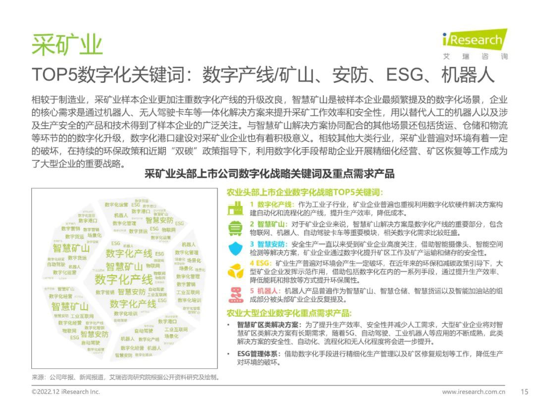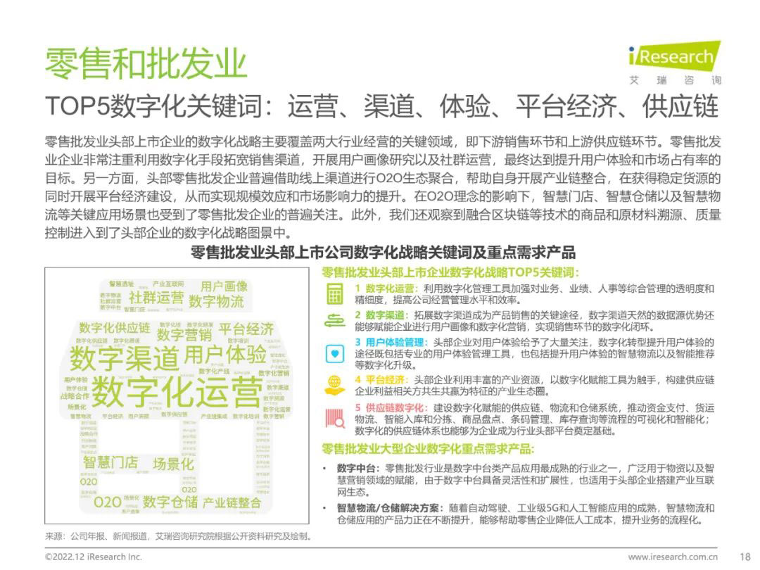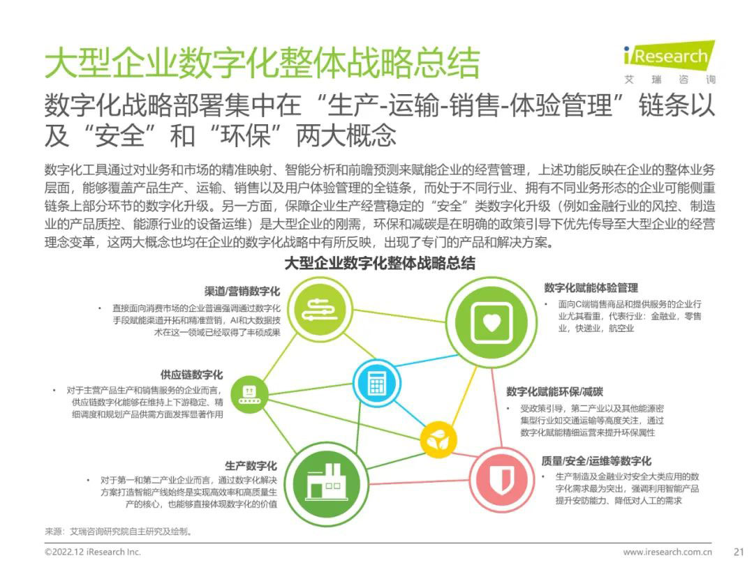 2021年中國(guó)大型企業(yè)數(shù)字化支出規(guī)模約為2.8萬億元,估算2021-2026年中國(guó)大型企業(yè)數(shù)字化支出平均復(fù)合增速將達(dá)到12.3%。基于對(duì)上市公司數(shù)字化戰(zhàn)略的分析,艾瑞咨詢發(fā)現(xiàn)大型企業(yè)數(shù)字化戰(zhàn)略部署集中在“生產(chǎn)-運(yùn)輸-銷售-體驗(yàn)管理”鏈條以及“安全”和“環(huán)?!眱纱蟾拍?。