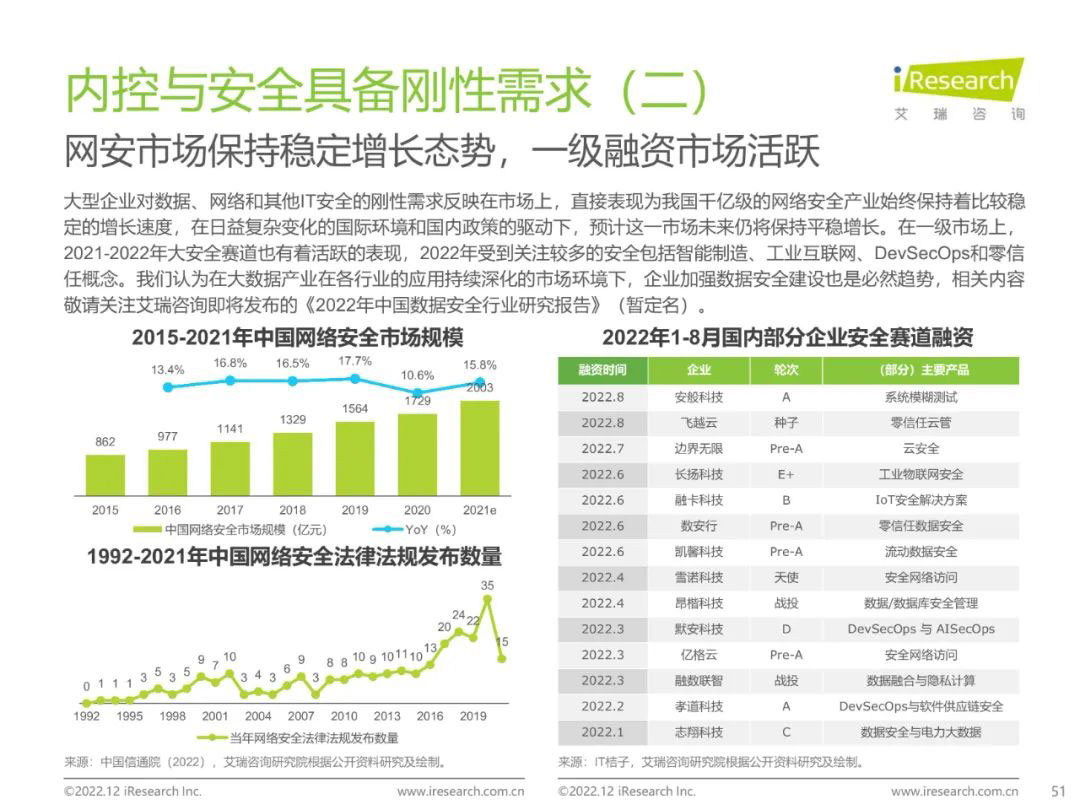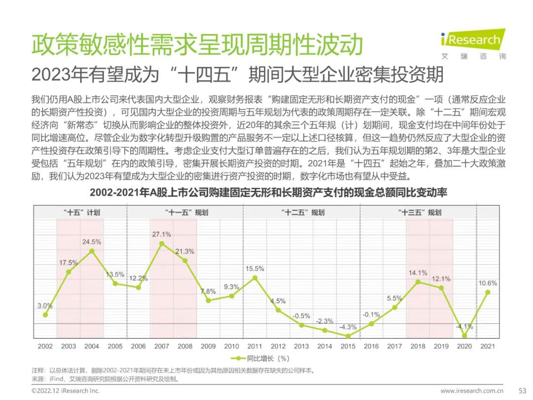 經(jīng)艾瑞咨詢核算,2021年中國(guó)大型企業(yè)數(shù)字化支出規(guī)模約為2.8萬億元,估算2021-2026年中國(guó)大型企業(yè)數(shù)字化支出平均復(fù)合增速將達(dá)到12.3%。受疫情和宏觀經(jīng)濟(jì)增長(zhǎng)狀況影響,2020和2022年大型企業(yè)數(shù)字化支出增速有所波動(dòng),預(yù)計(jì)2023年市場(chǎng)景氣度將有所恢復(fù)。整體來看,由于大型企業(yè)數(shù)字化轉(zhuǎn)型需求具備相對(duì)剛性,且大型企業(yè)自身扛風(fēng)險(xiǎn)能力較強(qiáng),市場(chǎng)增速整體平穩(wěn)。