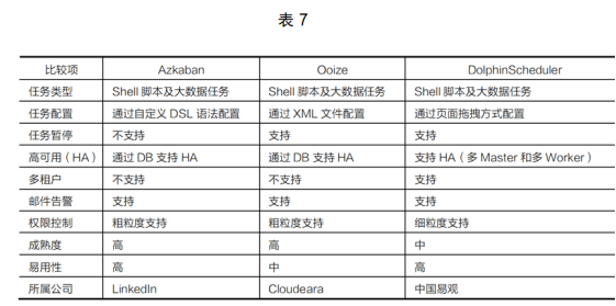 包括Azkaban、Ooize、DolphinScheduler等。它們適用于普通定時執(zhí)行的例行化任務,以及包含復雜依賴關系的多級任務進行調(diào)度,支持分布式,保證調(diào)度系統(tǒng)的性能和穩(wěn)定性,它們之間的區(qū)別見表7。