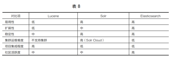 在選擇全文檢索引擎工具時,可以從易用性、擴展性、穩(wěn)定性、集群運維難度、項目集成程度、社區(qū)活躍度這幾個方面進行對比。Lucene、Solr和Elasticsearch的對比見表8。